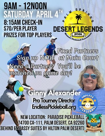 We are excited to announce the 2026 Desert Legends Pickleball Tournament will be held at the Paradise Pickleball Courts in Palm Desert.